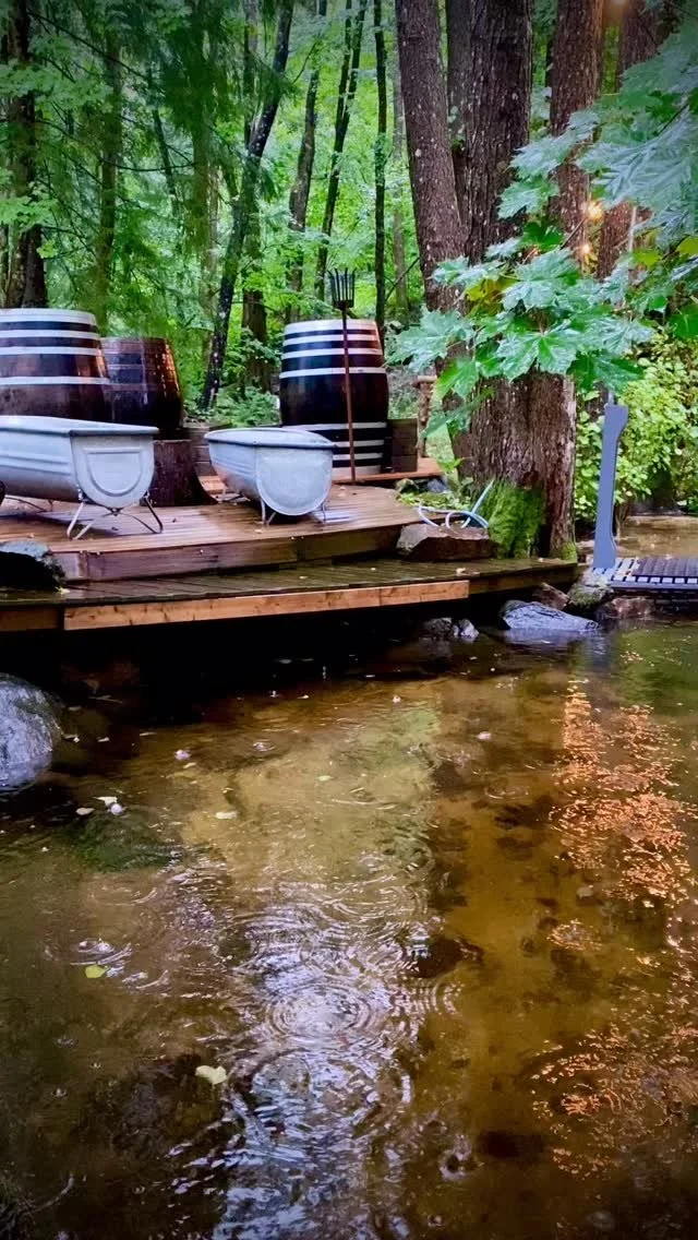 På skogsbadet er det en naturlig kaldkulp som har friskt og rent vann som renner kontinuerlig igjennom. Vi har i tillegg en utedusj, sinkbadekar og tre eikefat som du kan kjøle deg ned i! Du får dermed anledning til å veksle mellom varme og kulde akkurat slik det passer deg!