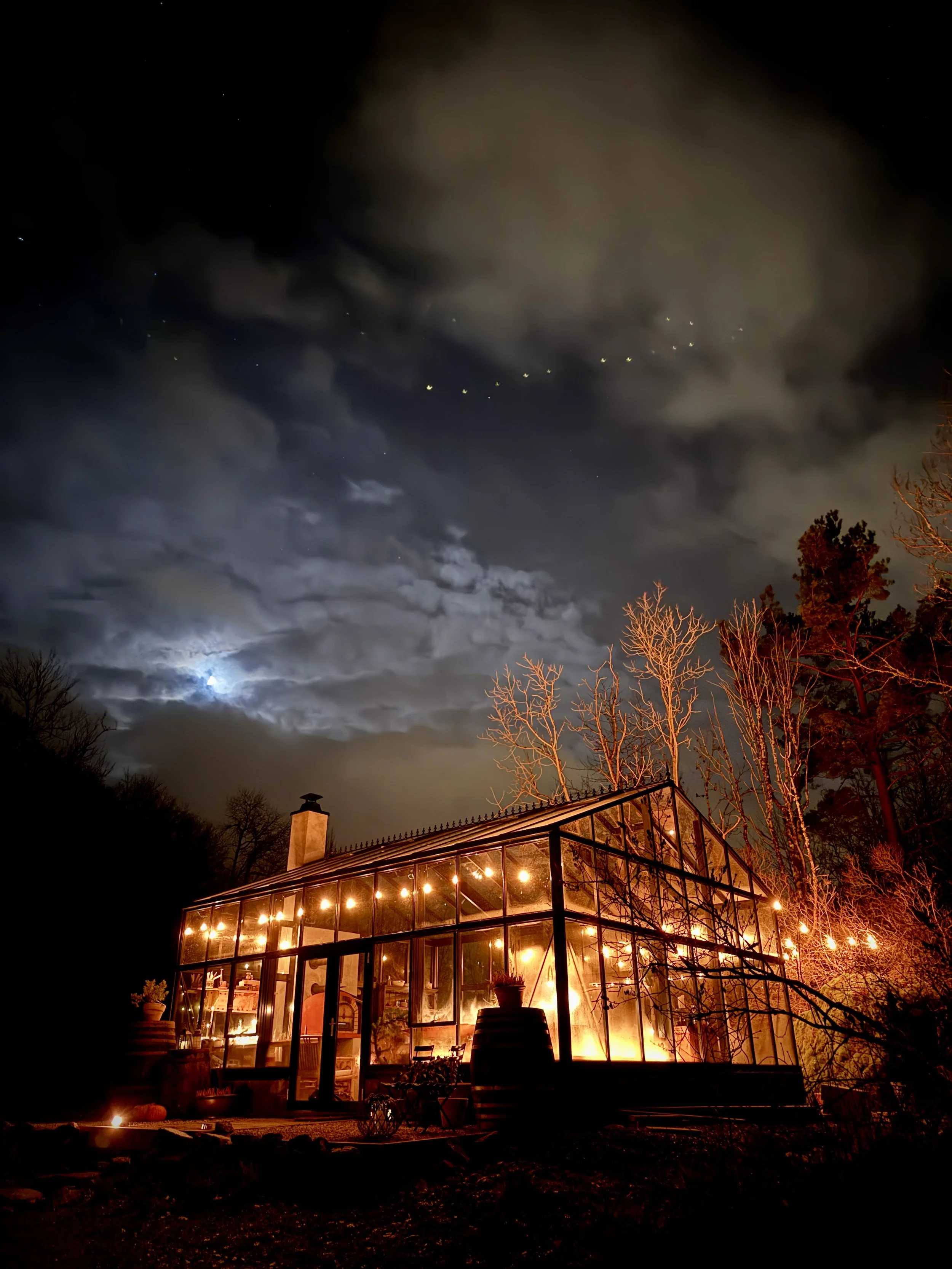 Et romslig og innbydende drivhus som kan tilpasses et hvert besøk. Alt fra samlinger, møtevirksomhet, små arrangementer eller som et supplement til overnatting eller i kombinasjon med et badstubesøk. Med mursteinspipe, vedovn og en stor bakerovn holder drivhuset en god temperatur fra tidlig vår til sen høst.