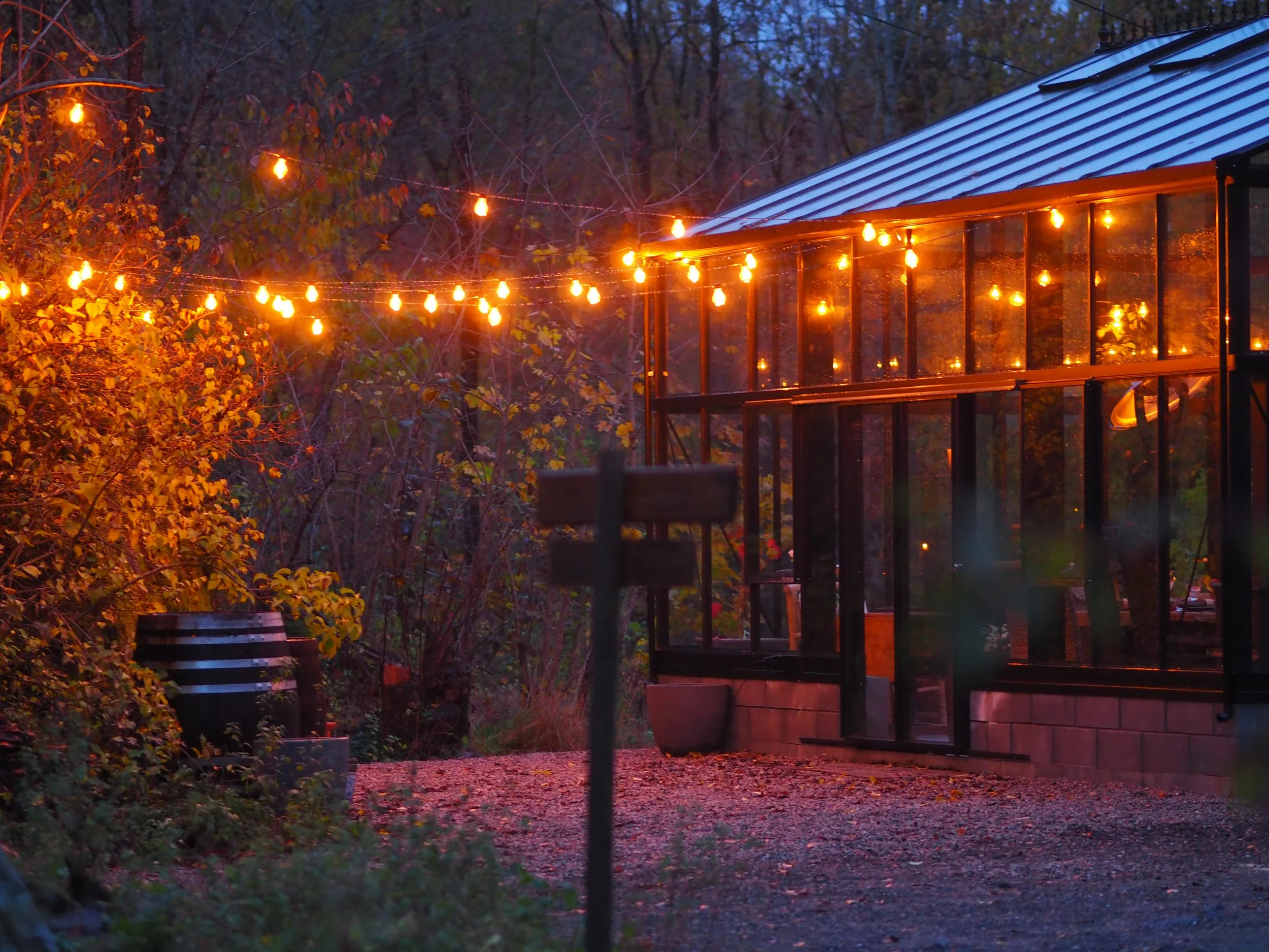 Rett ved skogkanten står vårt nye drivhus – et luftig, lunt og innbydende rom til alle årstider. Her kan man sitte tett på elementene, omgitt av naturen, skogen og et rikt og mangfoldig dyreliv.